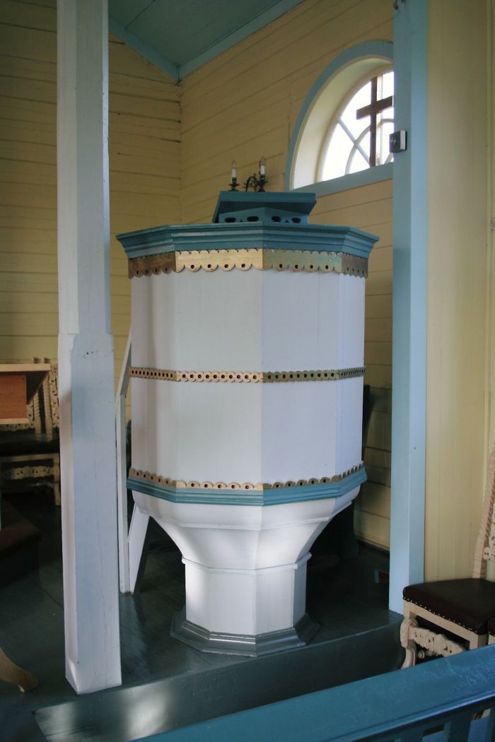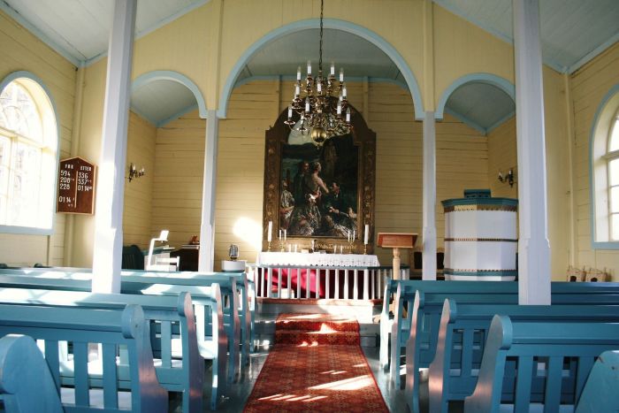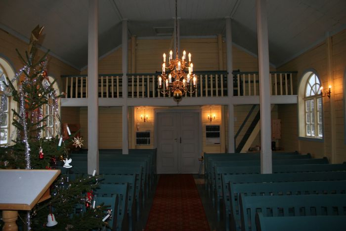 Det er galleri innenfor inngangen. Koråpningen har tre rundbuer, og korgulvet er hevet to trinn over skipets gulv. Prekestolen er ved den høyre korbuen og har oppgang fra koret.