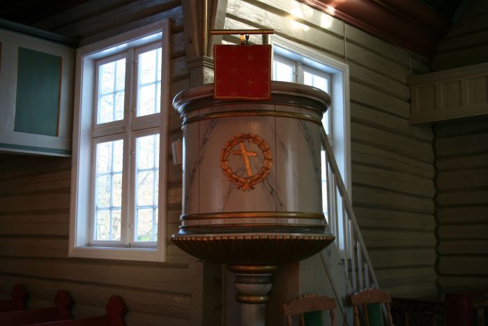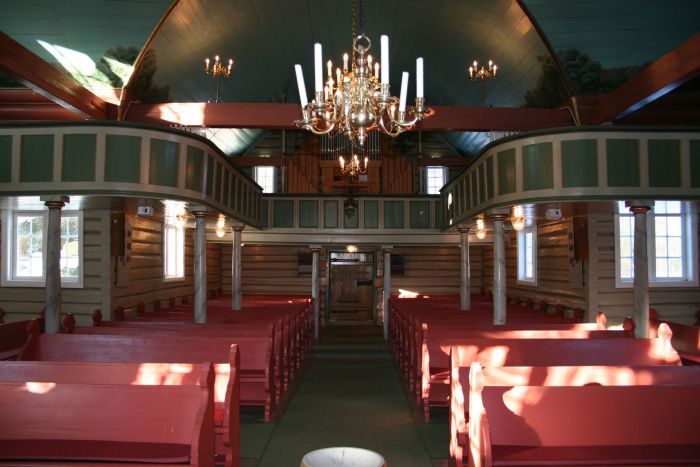 Innvendig er laftetømmeret flattelgjet og malt. Det er gallerier i tre av de fire korsarmene, med orgel i vest. Det er kor i østre korsarm.