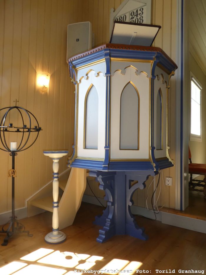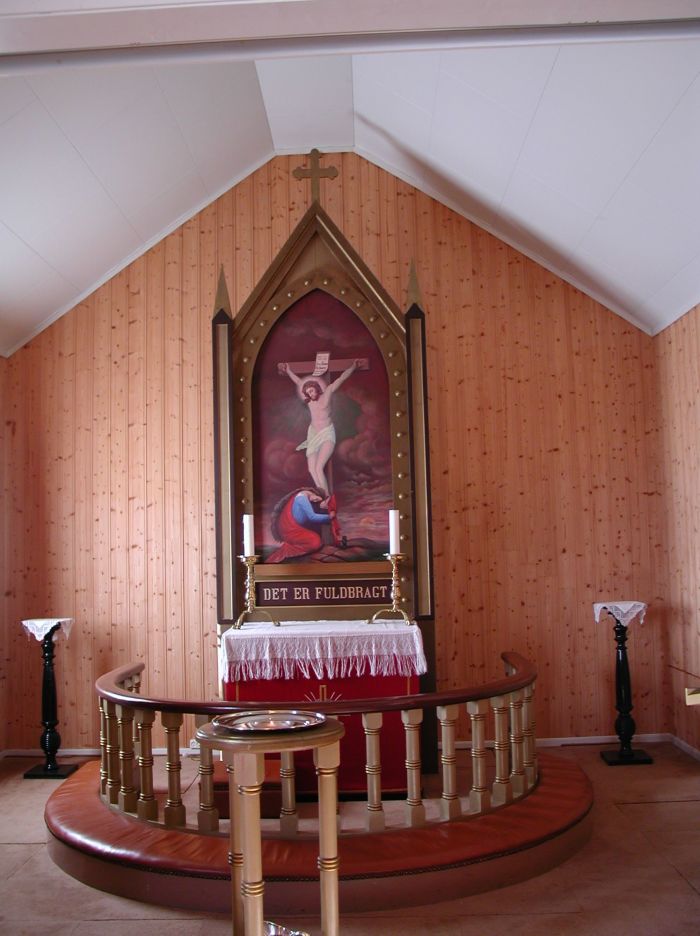 Altertavlen ble laget av Ole Garlaus (eller Ola Garlaus) i 1924 og viser tilbedelsen ved korset. Teksten under bildet lyder: «Det er fuldbragt (jf. Joh 19, 30). Prekestolen, av Petter Chr. Johnsrud, er fra 1925. Den ser ut til å ha blitt pusset opp og hevet i nyere tid; på et eldre bilde ser den ut til å ha oppgang fra koret, og fargene er annerledes. Døpefonten i tre er fra 1911. Kirkeklokken er fra 1913, fra Olsen Nauen. Alt dette er ifølge kirkeleksikonet.