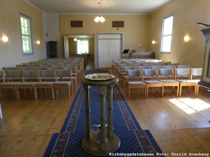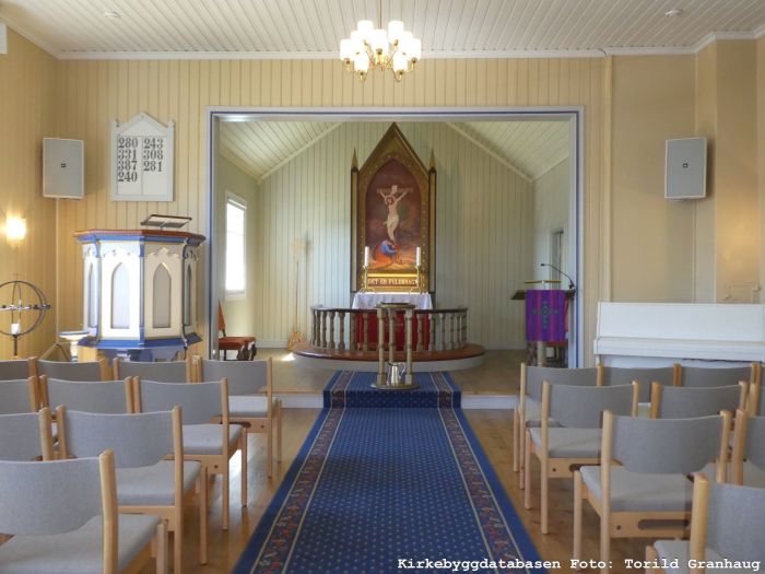 Kirkerommet er møblert med vanlige stoler. Koråpningen er rektangulær, og korets gulv er hevet et trinn over skipets gulv.