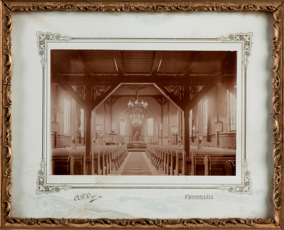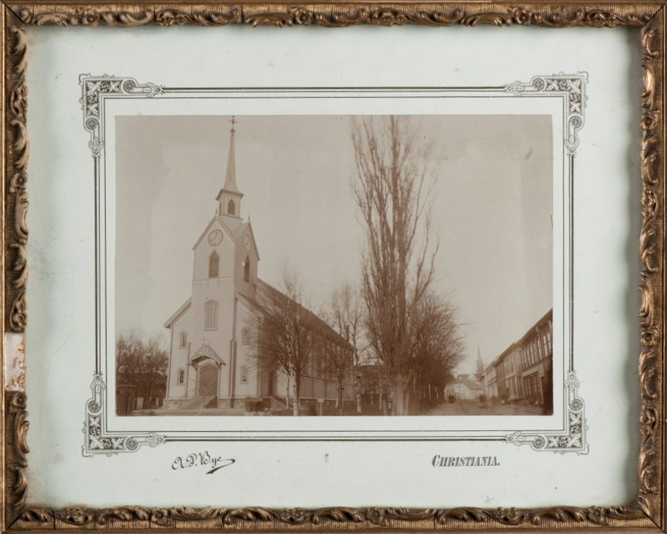 Den fremvoksende byen nådde opp i 2 500 innbyggere på 1870-tallet, og den 10. desember 1872 ble byens første kirke innviet. Det var en liten, hvit trekirke (bindingsverk) som var tegnet av Jacob Wilhelm Nordan. Den lå litt sør for den nåværende kirken, mellom Kongens gate og Rådhusgaten på vestsiden av Storgaten. Det er heller ikke langt fra Sandar kirke. Av inventar her kan nevnes alterbord laget av snekker L. Jakobsen, alterbilde malt av Otto Mengelberg (Jesus i Getsemane; motivet ligner på det han hadde malt til Grimstad kirke), prekestol tegnet av Wilhelm von Hanno, orgel bygget av Amund Eriksen og kirkeklokker støpt av O. Olsen & Søn. Sandefjord ble utskilt som eget kirkesogn og prestegjeld i 1877. Denne Sandefjords første kirke ble imidlertid flammenes rov i den store bybrannen natt til 16. mars 1900.