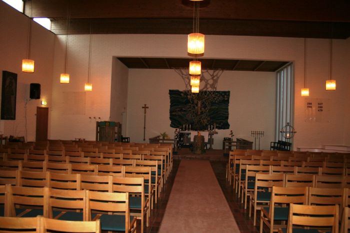 Koret er lavere og smalere enn skipet, og det har belysning fra vinduer som dekker hele den ene sideveggen. Alterpartiet er på et podium hevet et lite trinn over resten av kirkegulvet.