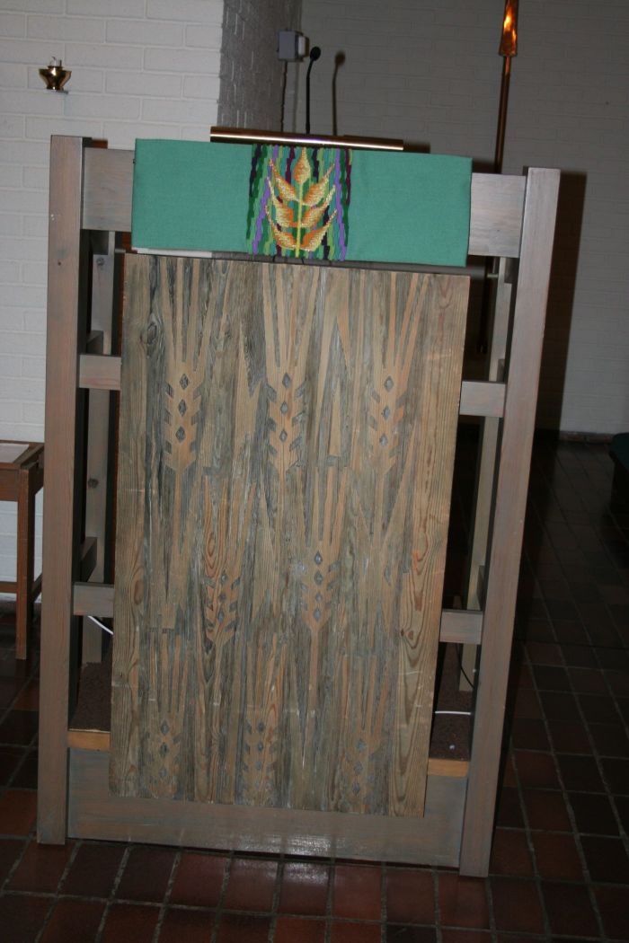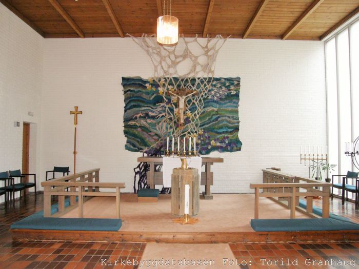 Det meste av det sentrale inventaret er på alder med kirken, altså fra 1977. Altertavlen er et vevet teppe av Else Marie Jakobsen med tittelen «Livets hav» med et krusifiks av Brit Sørensen (Bakken). Prekestolen er formgitt av arkitekten. Kirken har glassmalerier av Hans L. Rasmussen.