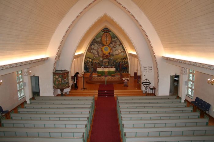 Axel Revold har dekket hele korveggen med et maleri som av kirkeleksikonet tituleres «De tre troens artikler». Det er vel mer opplysende å si at det illustrerer pinseunderet. På alteret står et krusifiks.