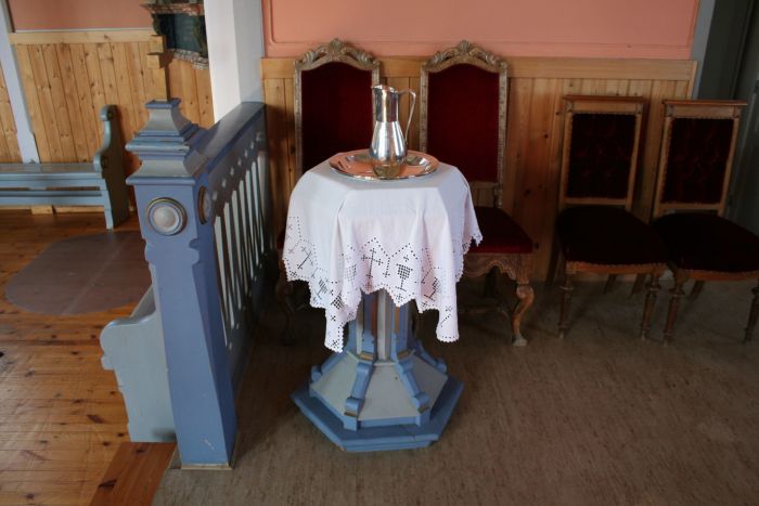 Det er orgelgalleri bakerst i kirkerommet. Koret åpner seg mot skipet i sin fulle bredde, men er litt avskjermet i høyden. Korgulvet er hevet to trinn over skipets gulv. Det er korskille i form av en lav skranke på hver side av midtgangen. Prekestolen står i koråpningens høyrekant (sør) og har oppgang fra koret.