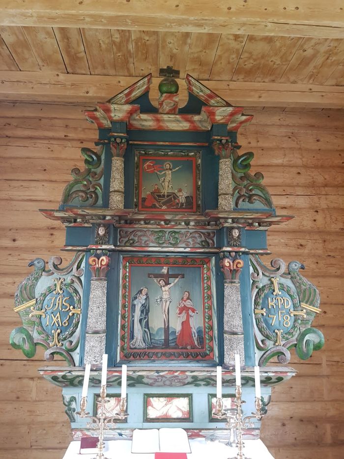 Den barokke altertavlen er overført fra gamlekirken. Den er fra 1678, et årstall vi finner malt på medaljongene som flankerer hovedbildet (sammen med givernes initialer), skjønt dette malerarbeidet ble utført først i 1773 av Paul Kolset, som også malte bildene i midtfeltene. De viser korsfestelsen (med Maria og Johannes) og oppstandelsen.