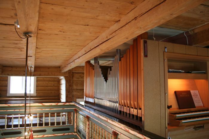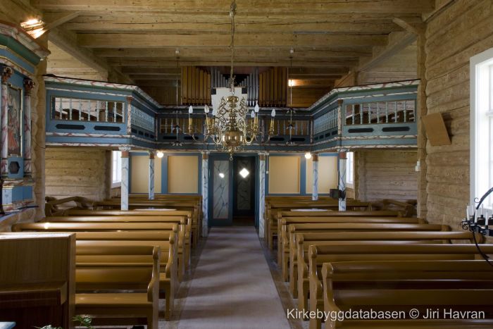 Inne i kirken er laftetømmeret synlig. Det er orgelgalleri i vest, og galleri også et stykke langs langveggene og i tverrskipene. Koret er i østre korsarm, med gulvet hevet et lite trinn over gulvet i resten av kirken. Over kordøren var opprinnelig noen utskjæringer med årstallet 1773 og Kristian VIIs kongemonogram. Dette er nå i Tromsø museum.