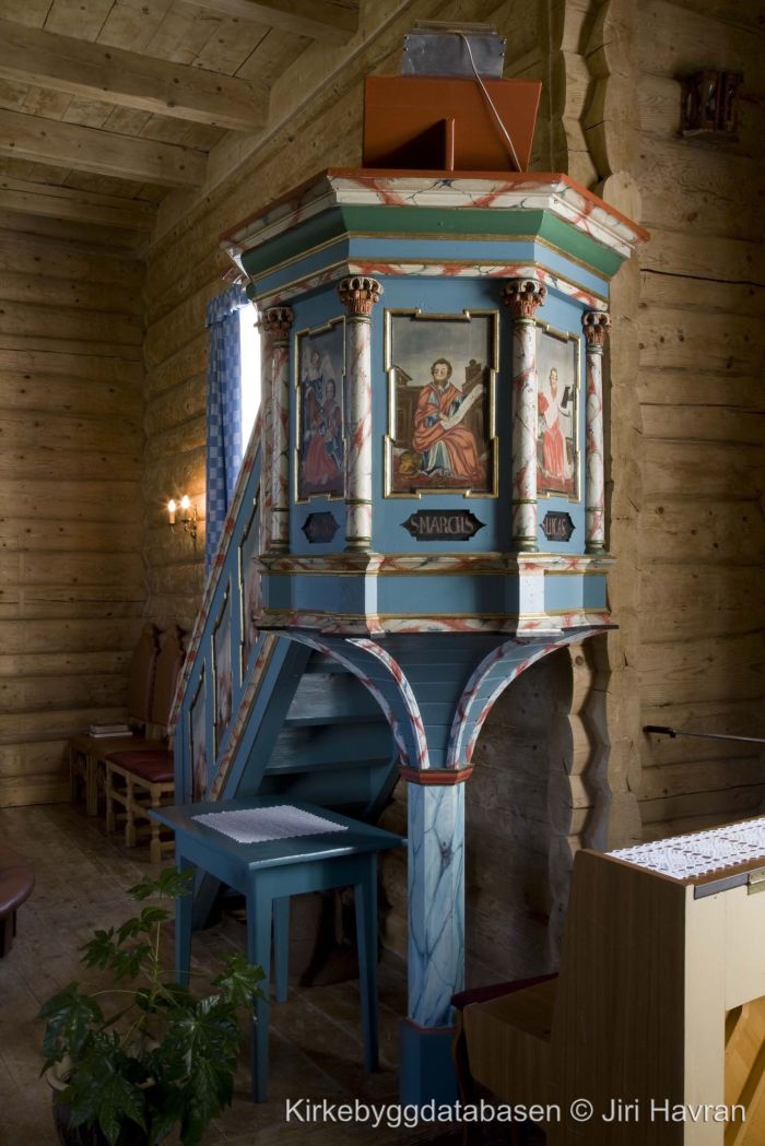 Prekestolen står til høyre i koråpningen og har oppgang fra koret. Dens opphav ser ut til å være ukjent, men den skal også være malt av Kolset. Selve stolen har evangelistbilder. På veggen ved siden av prekestolen er et timeglass som også er overført fra gamlekirken. Det finnes også en nyere lesepult.