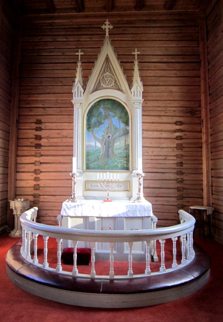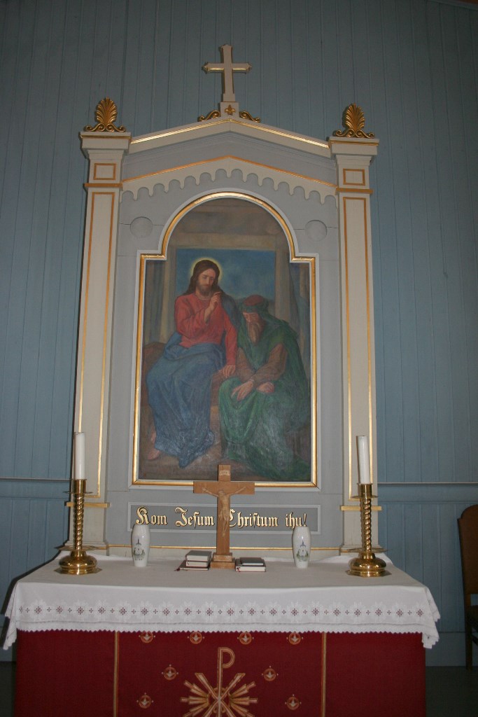 Den nygotiske altertavlen hadde opprinnelig bare et stort kors, men fikk i 1939 et Getsemane-bilde malt av fru sogneprest Gjessing. På bildet står Jesus bøyd mot et tre med ryggen til menigheten, og tekstvalget kan synes noe underlig: «Kom til mig!» (Matt 11, 28)