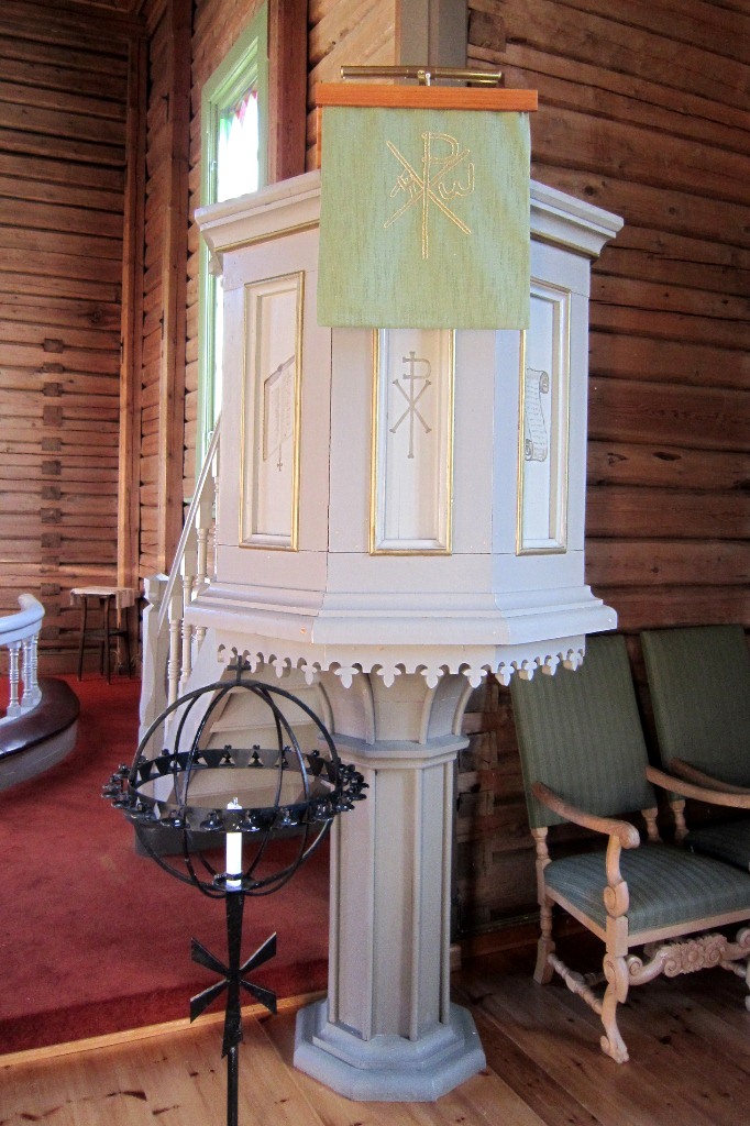Både prekestolen (seks fag med smale fyllinger) og døpefonten (åttekantet) står inne i koret — prekestolen til venstre og døpefonten til høyre. Begge er på alder med kirken. Det finnes også en enkel lesepult.