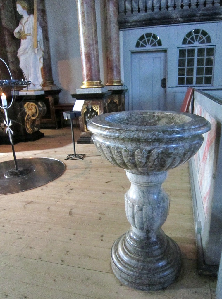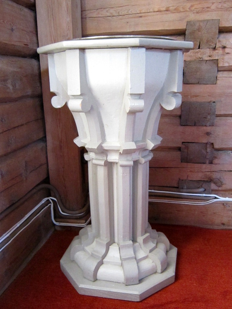 Døpefonten er åttekantet — eller, om man vil, firkantet med riflete hjørner. Den har to sider med kristogram og to med due som stuper. Den ble restaurert til hundreårsjubileet og malt opp igjen i 2005. Dåpsfatet i tinn er fra 1760, og en dåpskanne ser ut til å ha vært gitt i gave da kirken var ny.