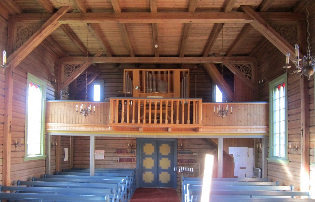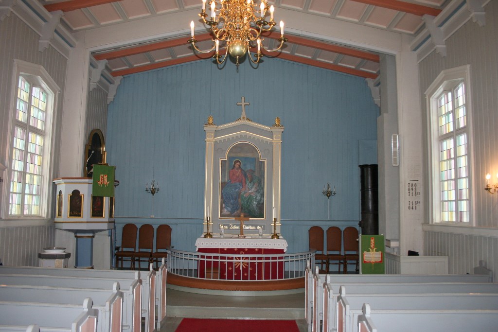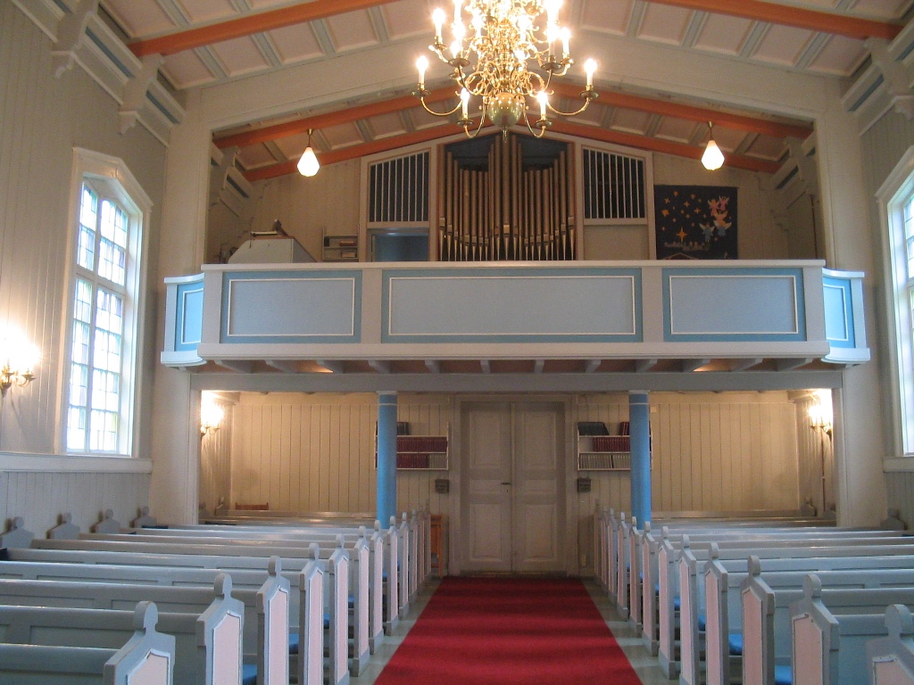 Som altertavle fungerer et kors på veggen bak alteret. Orgel er nevnt, uten at undertegnede har klart å bringe på det rene hva slags orgel kirken har. (Det sier jubileumsheftet ingenting om.)