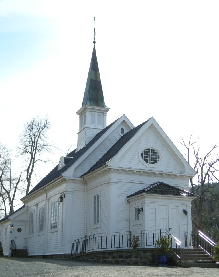 Vi har å gjøre med en langkirke i tre med 150 plasser. Stilen er svært påvirket av klassisisme fra embedsmannsgårder, og markerer et brudd med den bygotikken og sveitserstilen som hadde dominert innen kirkearkitekturen frem til århundreskiftet. Kirken følger nødvendigvis lengderetningen på knausen den ligger på. Den har inngang i nordvest og kor i sørøst. Våpenhus med utbygg i nordvest gjør at bygget er nesten (men bare nesten) symmetrisk også i lengderetningen. Symmetrien i bredderetningen brytes bare av sakristiet på korets østside. Kirken har takrytter midt på skipet.