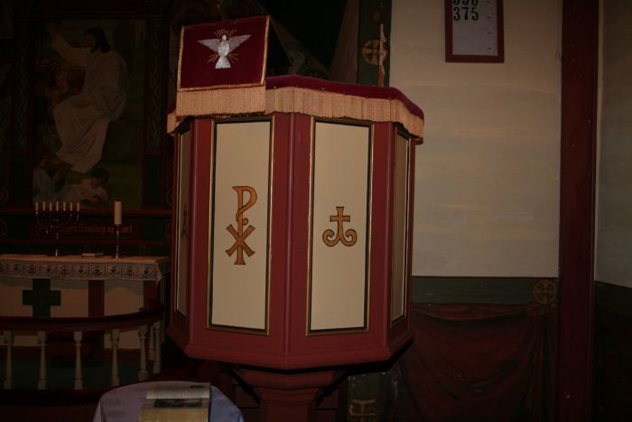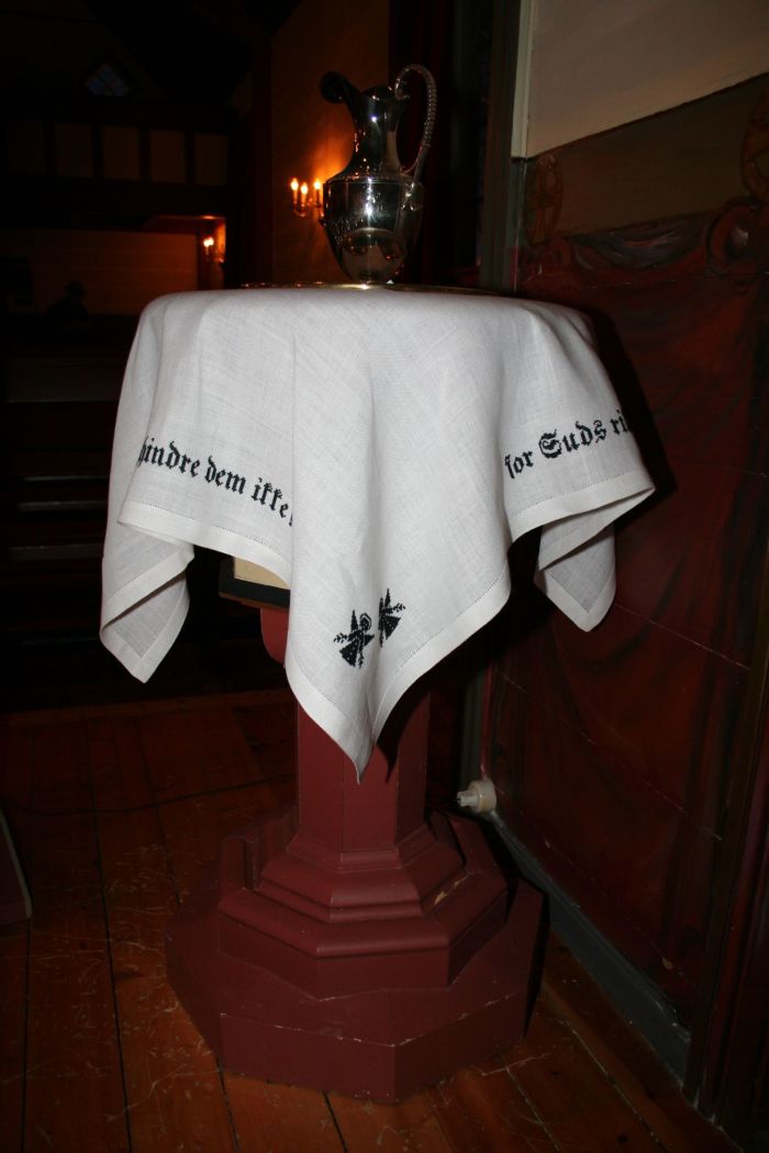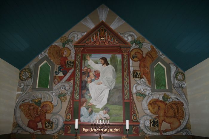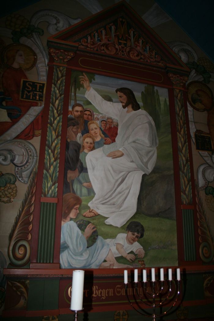 Til å begynne med stod det en gipskopi av Bertel Thorvaldsens populære kristusstatue fra Vor Frue kirke i København på alteret. Altertavlen ble malt av Fritz Wilhelm Gjøs og kom på plass i 1922. Den ble først montert i bakkant av alteret, men ved utsmykningen i 1938–39 ble den festet til fondveggen. Bildet illustrerer Bergprekenen. Teksten i underkant er ikke fra Bergprekenen; den lyder: «Eg er Vegen, Sanningi og Livet» (Joh 14, 6).